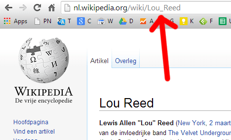 Door in de adresbalk te typen: "W Lou Reed" krijg ik meteen informatie over Lou Reed uit Wikipedia.