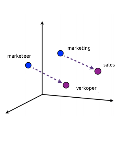 Het kijkt niet enkel naar de woorden in de vraag, maar kijkt ook naar associaties. Het algoritme kan gerelateerde woorden bepalen op basis van woordvectoren, een techniek waarbij de relatie tussen woorden is vastgesteld in een dimensionale ruimte. Het voorbeeld in het plaatje is een zeer vereenvoudigde weergave over slechts drie dimensies. Zo zal het woord ‘marketing’ in de ruimte dicht in de buurt liggen van woorden als ‘seo’ en ‘marketeer’, verder weg liggen van woorden als ‘sales’ en ‘verkoper’ en nog verder weg liggen van het woord ‘vacature’. Op basis van een woordvector kan het algoritme verbanden (afstanden) leggen tussen verschillende woorden. Als het algoritme de vector marketing → marketeer weet, kan de relatie verkoop → verkoper hieruit worden afgeleid.