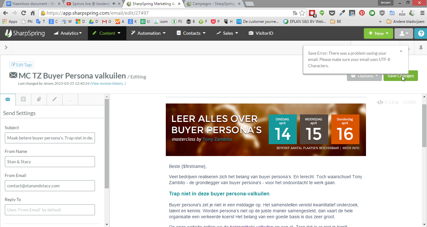 Soms geeft Sharpspring nogal vage foutmeldingen die je totaal op het verkeerde been zetten. Persoonlijk ben ik ruim een uur bezig geweest met deze: “Save Error: There was a problem saving your email. Please make sure your email uses UTF-8 Characters.” Na alle speciale karakters (é,ï,ë) te hebben gecontroleerd op juiste UTF-notatie kreeg ik opeens een inval. Het euvel zie je al in het screenshot. Zie jij ‘m? In Sharpspring werk ik vaak in verschillende tabs. Dat is handig als je verschillende e-mails moet wijzigen. Maar het gaat mis als je in een van die tabbladen wisselt van klantaccount. Ik snap dat Sharpspring dan in de war raakt (sessie), maar het probleem is dat de foutmelding je totaal op het verkeerde been zet.