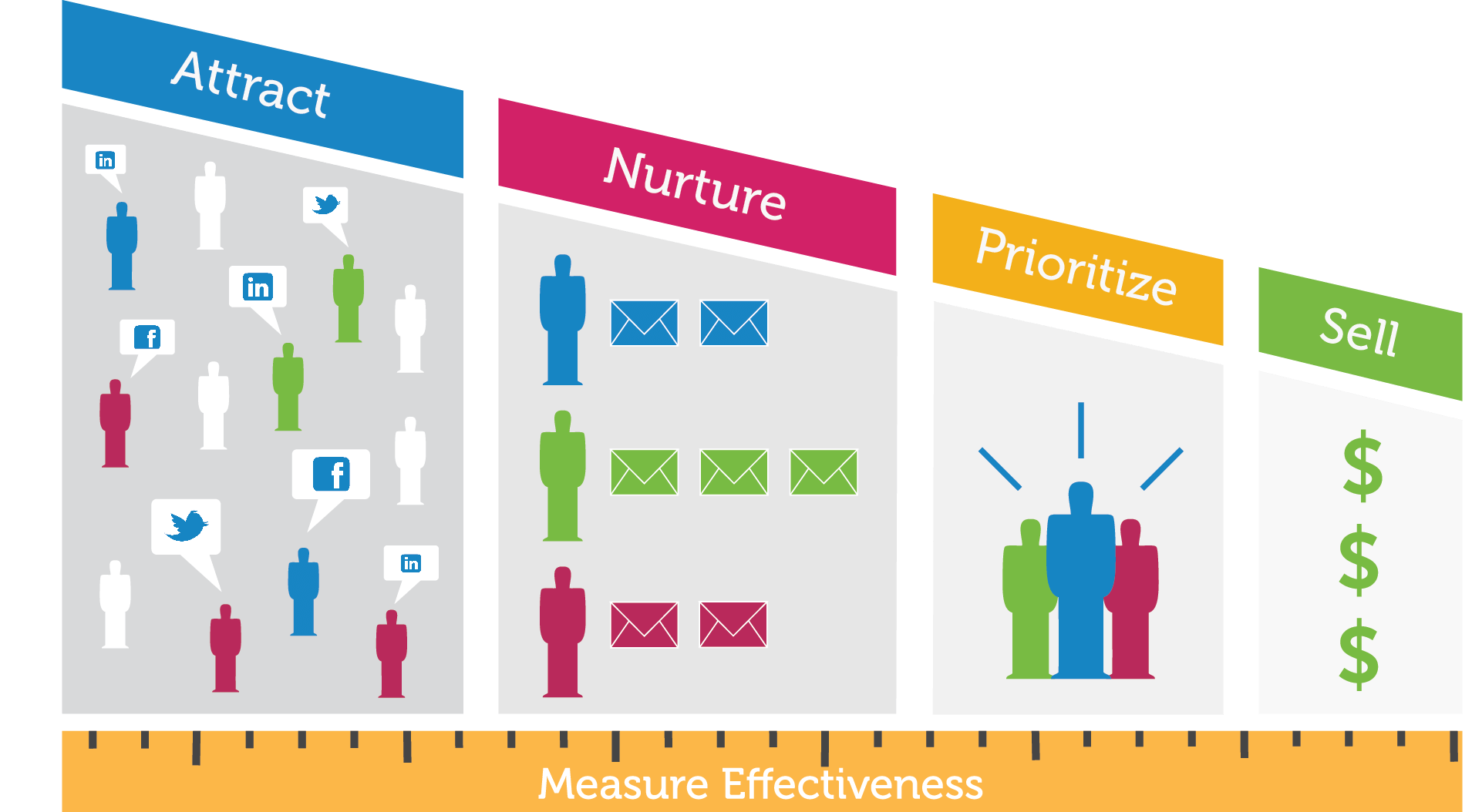 Marketing automation bestaat uit de volgende onderdelen: leadgeneratie, lead nurturing en lead scoring.